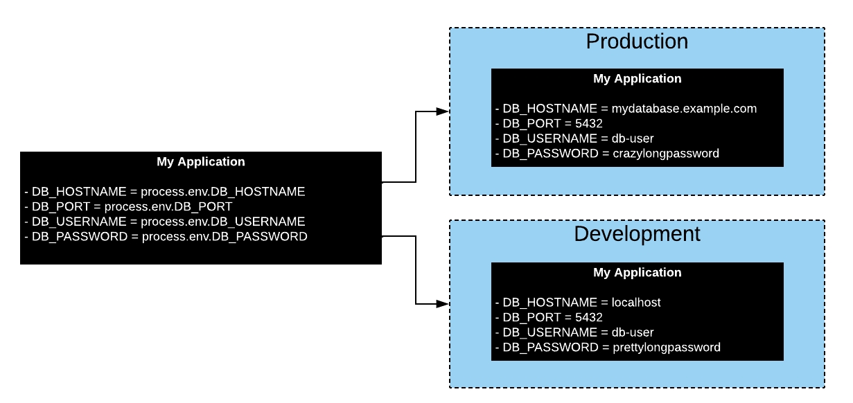Environment variables are used to configure your application to run in a specific environment. These environments are generally local development (your laptop), production (a hosted server), and other hosted servers related to non-production environments.
